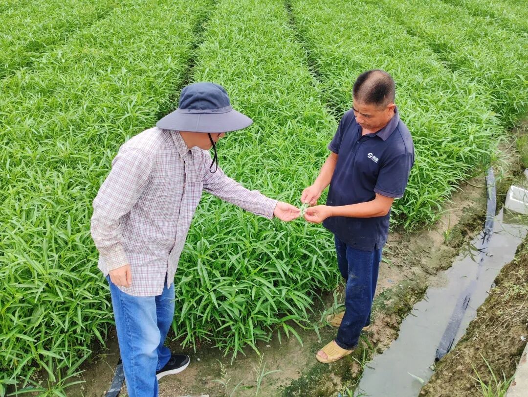 在合作社绿叶菜种植基地,林翮飞通过田间调查发现,基地主栽的空心菜出现白锈病病害迹象。结合合作社近期生产与销售计划,林翮飞与负责人共同商定“及早采收+综合预防”的双重策略:对已达采收标准的菜株及时抢收,降低病害导致的损失;对尚未成熟的作物,则建议通过合理密植、加强通风、科学喷施生物农药等方式控制病情扩展,确保后续生产安全。